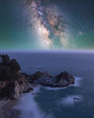 The Milky Way rises over McWay Falls on the Big Sur coast.